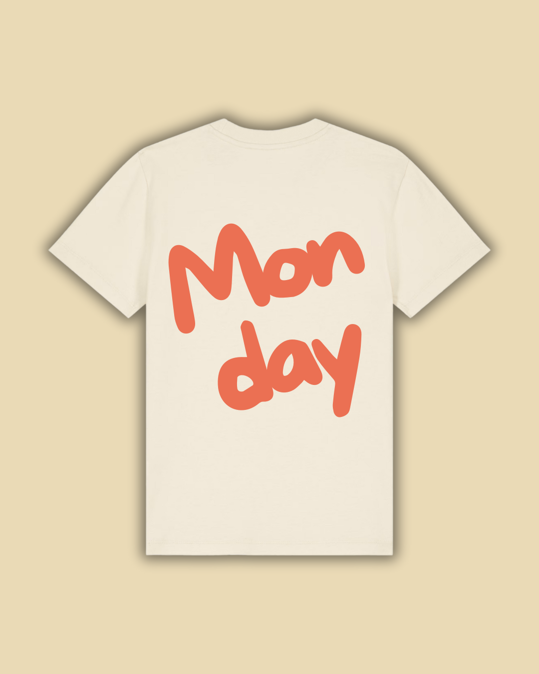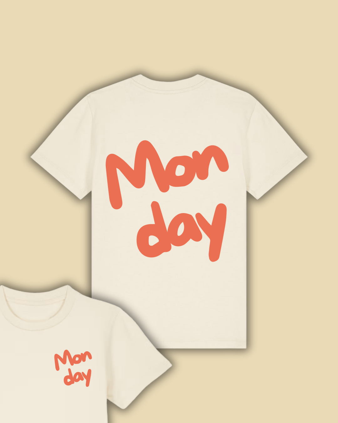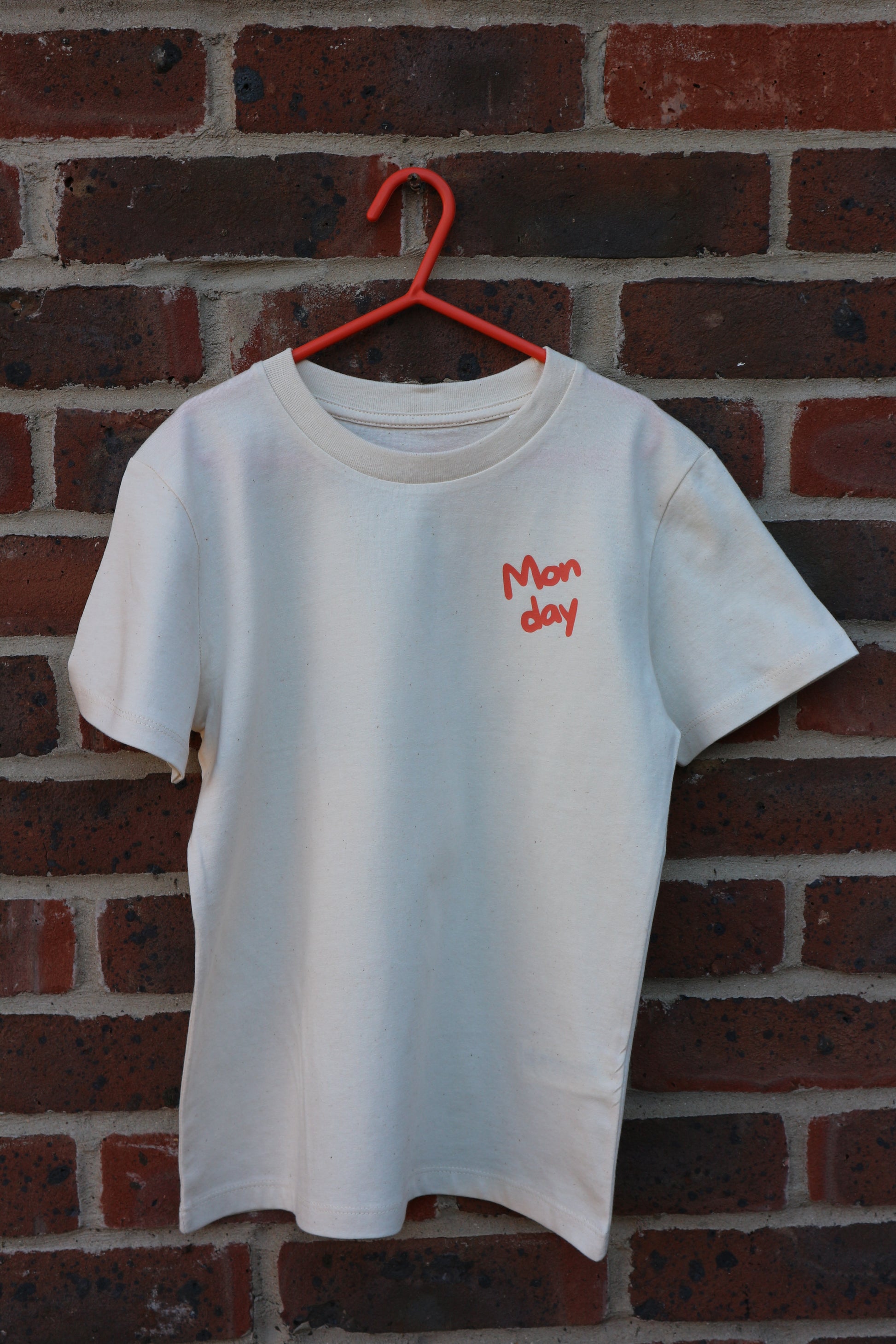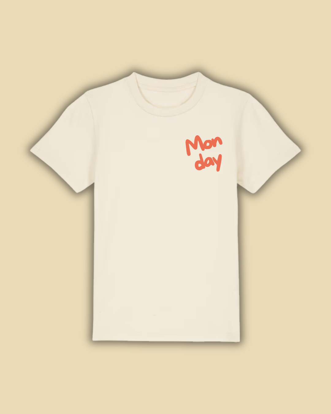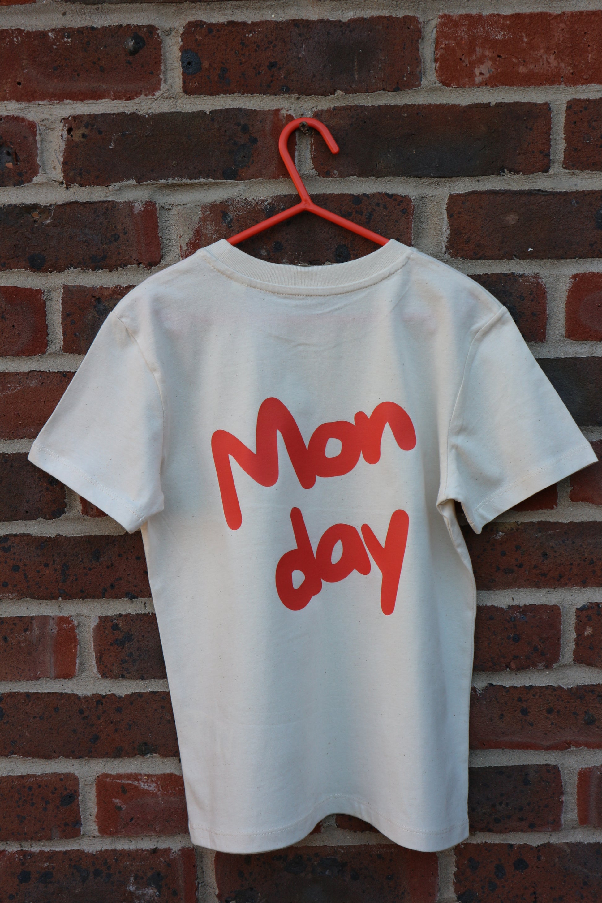 Featuring a bold fiesta red (more like orange) “Monday” print on the back and a matching mini print on the front left (no actual pocket, we’re not that organised), it’s designed for playdates, dinner refusals, and snack negotiations.
